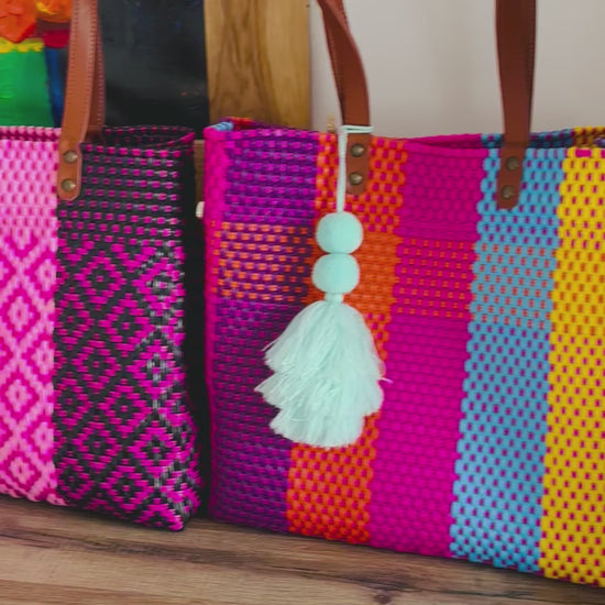 🌸 Tressé à la main à partir de plastique recyclé ♻️, ce tote bag allie style, praticité et engagement écologique. Les anses en cuir et les fermetures latérales apportent une touche de raffinement tout en assurant solidité et confort.