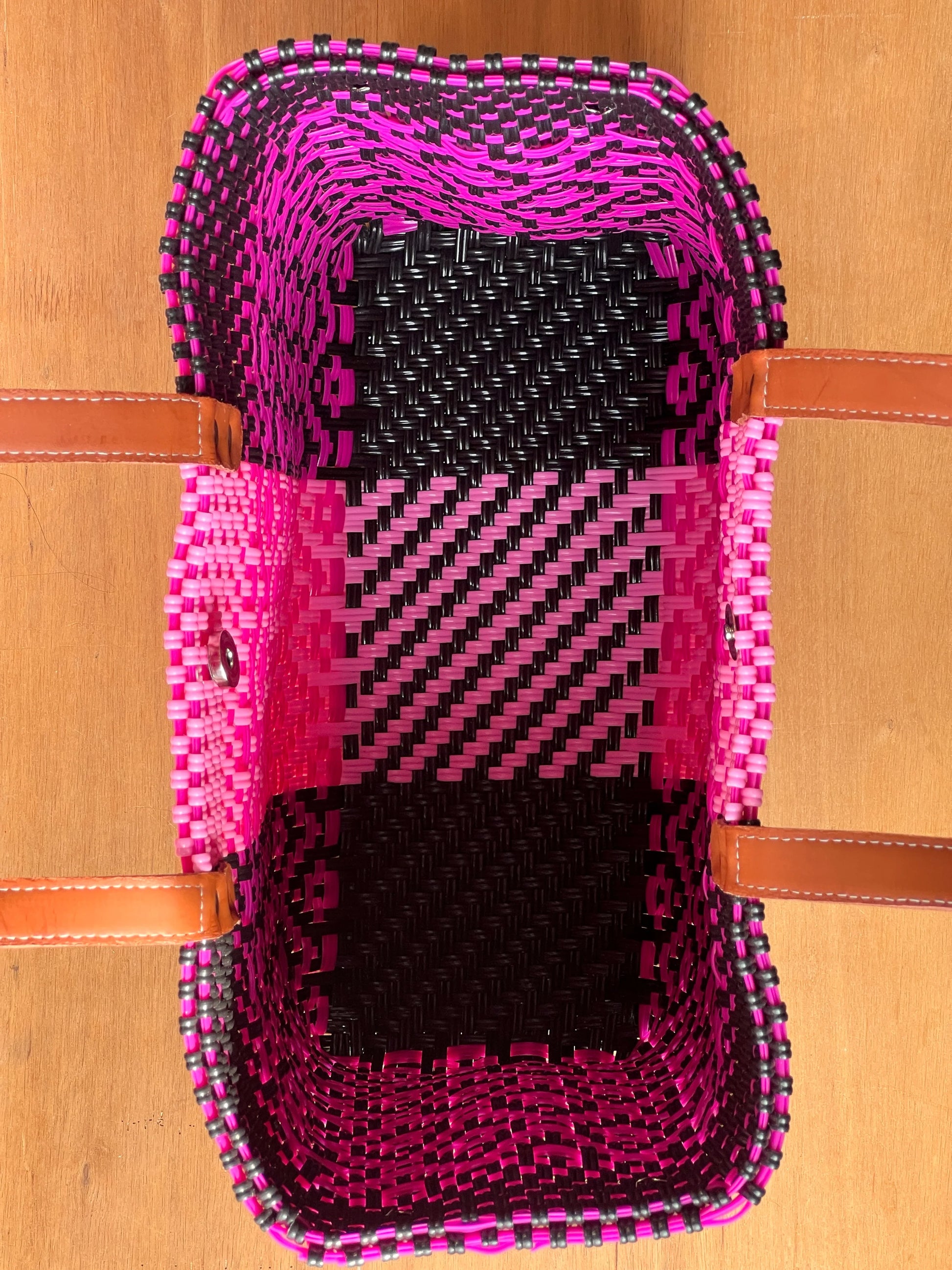 🌸 Tressé à la main à partir de plastique recyclé ♻️, ce tote bag allie style, praticité et engagement écologique. Les anses en cuir et les fermetures latérales apportent une touche de raffinement tout en assurant solidité et confort.