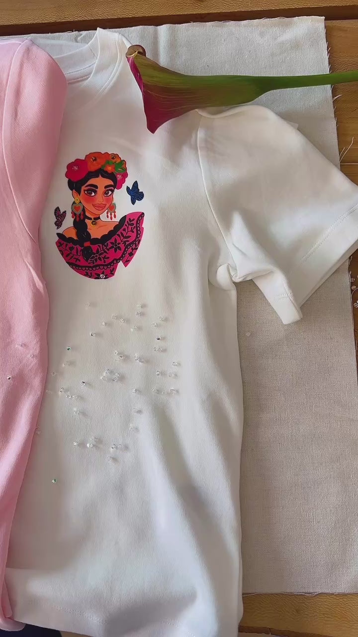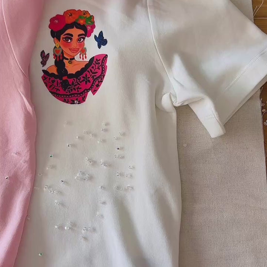 T-shirt María Charra imprimé devant et derrière fond Rose avec appliques perles