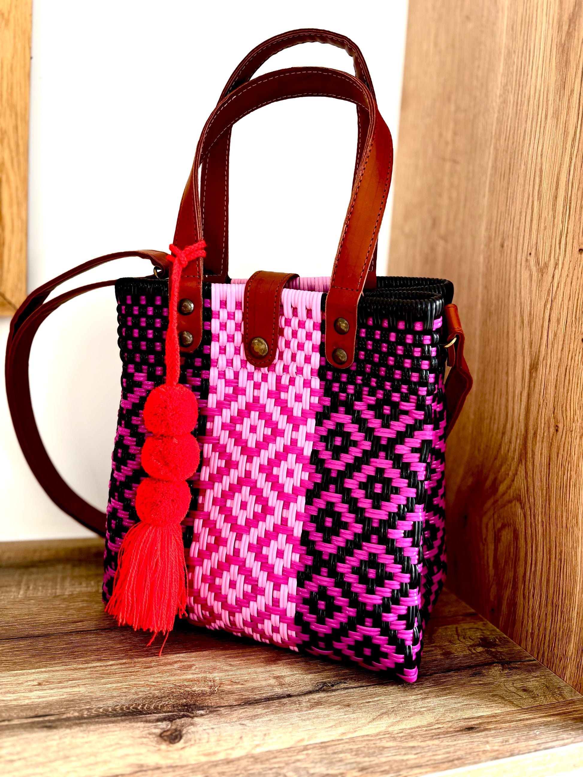 🌸 Confectionné à la main à partir de plastique recyclé ♻️, ce sac allie éco-responsabilité et élégance. Finitions en cuir : poignée, bande décorative, attaches latérales et bandoulière pratique, que vous pouvez retirer selon vos envies.