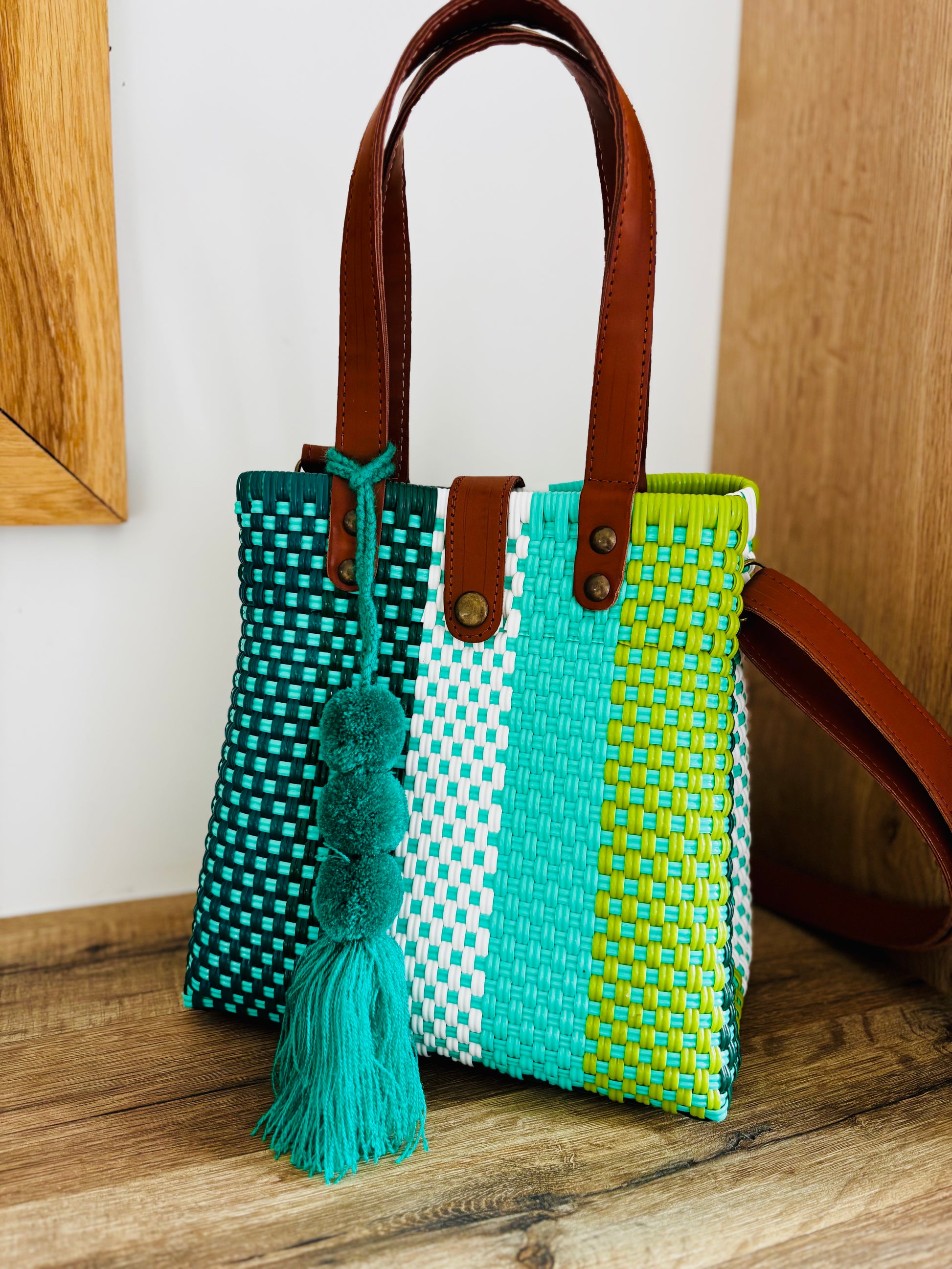 🌸 Confectionné à la main à partir de plastique recyclé ♻️, ce sac allie éco-responsabilité et élégance. Finitions en cuir : poignée, bande décorative, attaches latérales et bandoulière pratique, que vous pouvez retirer selon vos envies.